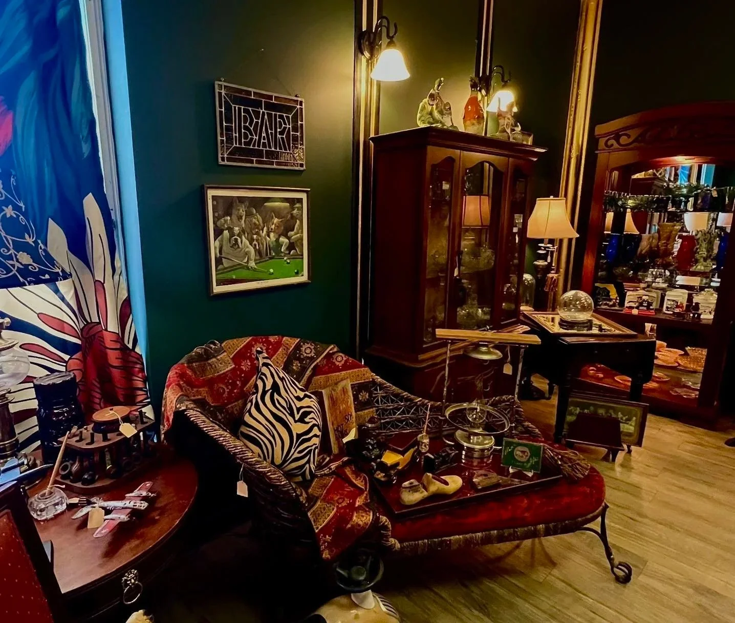 Much like Peacocks are often recognized as symbols of renewal and rebirth, our store seeks to forge a space for antique pieces to maintain their use, honor, and history in modern spaces, but we also house newer furniture with Art Nouveau flair. We aim to provide customers with a beautiful collection of mixed merchandise, while also sharing tastes, scents, and sounds that will transport you back to the nostalgia of the 1920s, elevating your experience from a simple shopping trip to a journey into the past.